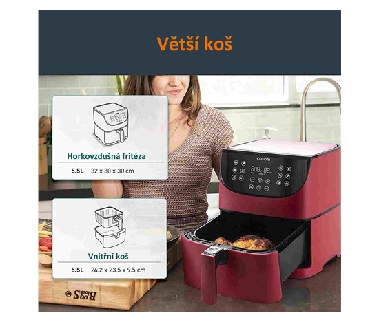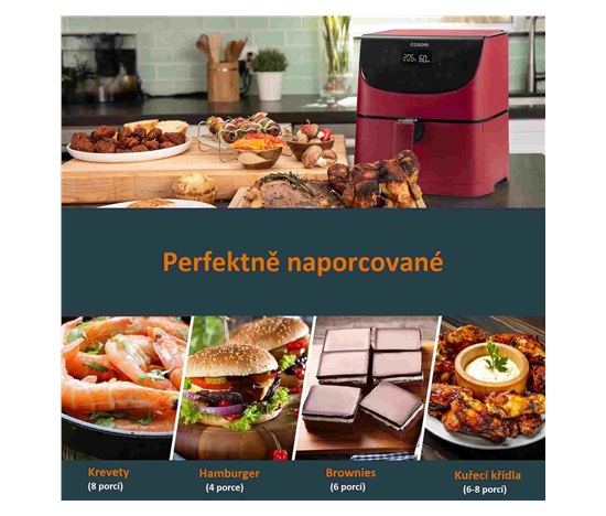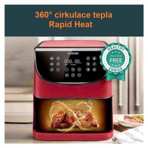 S horkovzdušnou fritézou COSORI CP158-AF PREMIUM si můžete užít vaše oblíbená smažená jídla bez výčitek, protože na rozdíl od běžného smažení nebo fritování je možné v ní připravovat jídla za použití velice malého množství oleje a nebo vůbec žádného. Kombinace cirkulujícího horkého vzduchu, dokonalé teploty vaření a chytrých programů zajistí, že hranolky budou vždy krásně křupavé a kuřecí stehna šťavnatá. Ať už je vaše jídlo čerstvé nebo mražené, stisknutím tlačítka můžete horkým vzduchem smažit kuřecí křídla, kuřecí prsa, sladké brambory, steaky, čerstvé hranolky a mnoho dalšího. Až budete mít hotovo, čištění bude stejně snadné díky nepřilnavému koši, který lze mýt v myčce. Díky veliké nádobě s objemem 5,5l navíc dokážete rychle navařit i pro větší rodinu nebo skupinu hostů.