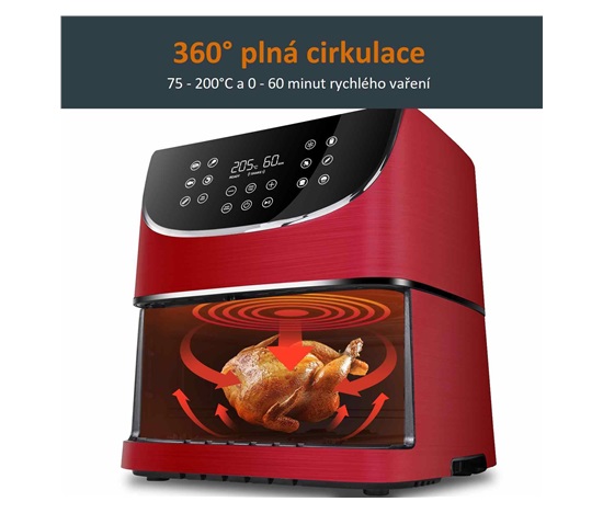 Horký vzduch rotuje kolem jídla ze všech stran a tím dosahuje kvalitního a rovnoměrného propečení a uvaření pokrmů. Díky této technologii se fritéza předehřeje během pouhých 5 minut.