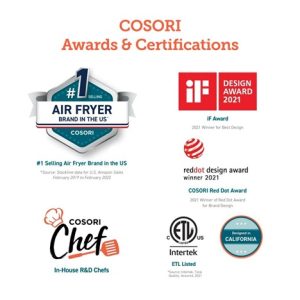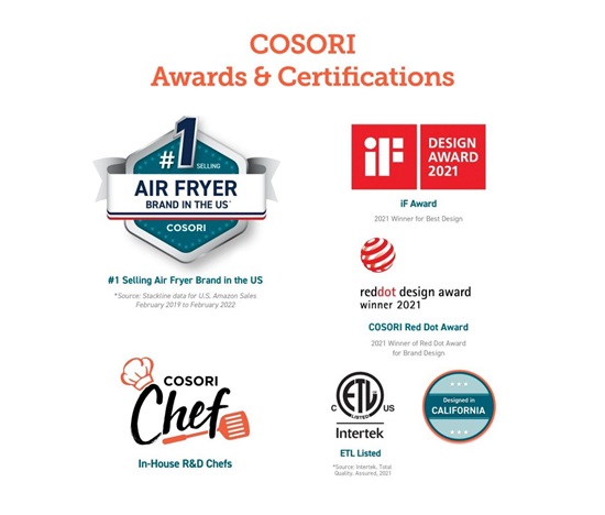 Design horkovzdušné fritézy COSORI byl navržen v Kalifornii. Díky své praktičnosti, funkcím, ovládání i přehlednému dotykovému nakloněnému LED displeji se snadno přístupnými tlačítky získali modely Cosori také prestižní ocenění Red Dot Award a Design Award za nejlepší design. Povrchová úprava je navíc odolná vůči otiskům prstů, takže fritéza bude ve vaší kuchyni vypadat pořád skvěle. Podle prodejních statistik je značka COSORI také nejprodávanější značkou horkovzdušných fritéz v USA.
