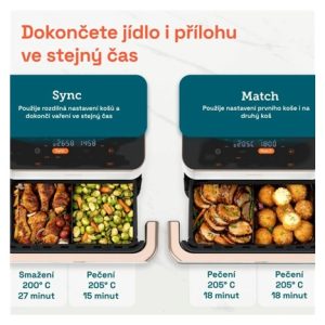 Fritéza disponuje důmyslnou funkcí Sync. Pokud koš rozdělíte na dva a chcete připravit dvě různá jídla, stiskem tlačítka Sync docílíte synchronizace vaření a dokončení ve stejný moment. Hotová příloha se tak nebude vysušovat při čekání na hotový hlavní chod. Funkce Match pak dovolí rychle nastavit stejný program v obou koších bez nutnosti dělat dvakrát to samé.