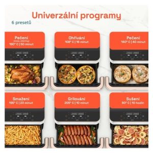 Cosori TwinFry zvládne díky šesti programům péct, fritovat, grilovat, péct sladké i slané a také třeba sušit. Je jedno jestli budete potřebovat celý 10l koš nebo vám stačí jen polovina. Fritéza rozdělením koše dokáže připravit dva nezávislé pokrmy, a to se hodí obzvlášť při přípravě jídla a přílohy najednou. Ovládací prvky jsou tak pohodlné a intuitivní, že se vaření stane záležitostí několika dotyků, a ne celodenního pobytu u kuchyňské linky.