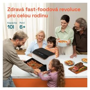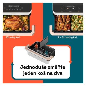 Chytrá horkovzdušná fritéza Cosori TwinFry přináší maximální objem varného prostoru pro početné rodiny nebo setkání a je doslova nadupaná funkcemi, které vám vaření maximální urychlí a usnadní. 10 litrový koš poslouží k přípravě velkých kusů masa, celé drůbeže, jehněčího hřbetu nebo mega porce hranolek. Opravdovým trumfem je možnost rozdělení koše přepážkou na dva 5 litrové a tak si můžete připravit hlavní jídlo a přílohu odděleně. S funkcí Sync navíc fritéza sladí přípravu obou tak, že vaření bude dokončeno ve stejný čas a vy budete mít své jídlo perfektní, čerstvé a chutné. Fritéza obsahuje 4 topná tělesa o celkovém výkonu 2800 W. Díky hornímu i spodnímu ohřevu odpadá nutnost protřepávání jídla během přípravy a také nutnost fritézu předehřát. Maximální teplota se zvýšila na 240 °C, takže fritéza zvládne i grilování. Jídlo můžete připravovat mnohem zdravěji, než s klasickými způsoby vaření jako je fritování v oleji. Například hranolky připravíte s jen jednou lžící oleje. Ve srovnání s pečením v troubě fritéza vyhřívá mnohem menší prostor, a tak spotřebuje pouze zlomek elektrické energie. Cosori TwinFry nabídne 6 univerzálních programů, které vám pokryjí všechny klasické způsoby přípravy jídla. Od pečení masa nebo zeleniny, sladké a slané pečení, grilování, fritování nebo přípravy zmražených jídel. Fritéza je navíc chytrá, a tak ji můžete ovládat vzdáleně přes aplikaci a mít přehled, kdy bude hotovo, zatímco vy potřebujete dokončit práci nebo se pobavit s dětmi. Fritéza prakticky zabírá jen plochu koše, a tak se hodí do všech kuchyní. Koš fritézy se snadno čistí a je možné jej mýt v myčce nádobí. V balení naleznete praktické kleště na bezpečnou manipulaci s jídlem.