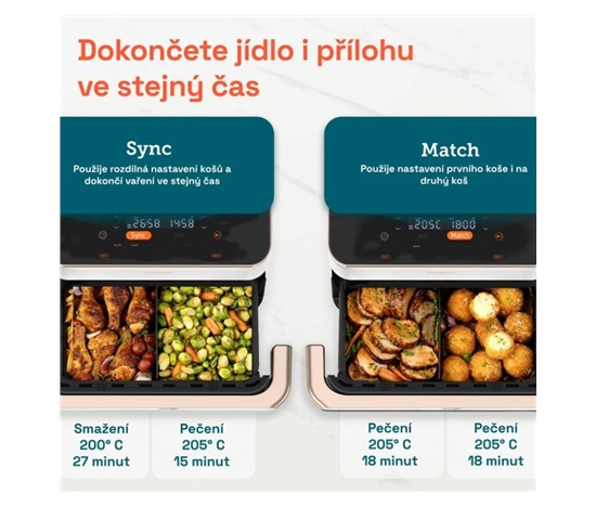 Fritéza disponuje důmyslnou funkcí Sync. Pokud koš rozdělíte na dva a chcete připravit dvě různá jídla, stiskem tlačítka Sync docílíte synchronizace vaření a dokončení ve stejný moment. Hotová příloha se tak nebude vysušovat při čekání na hotový hlavní chod. Funkce Match pak dovolí rychle nastavit stejný program v obou koších bez nutnosti dělat dvakrát to samé.