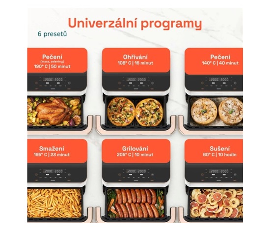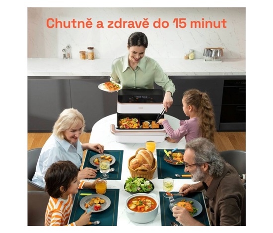 Cosori TwinFry zvládne díky šesti programům péct, fritovat, grilovat, péct sladké i slané a také třeba sušit. Je jedno jestli budete potřebovat celý 10l koš nebo vám stačí jen polovina. Fritéza rozdělením koše dokáže připravit dva nezávislé pokrmy, a to se hodí obzvlášť při přípravě jídla a přílohy najednou. Ovládací prvky jsou tak pohodlné a intuitivní, že se vaření stane záležitostí několika dotyků, a ne celodenního pobytu u kuchyňské linky.