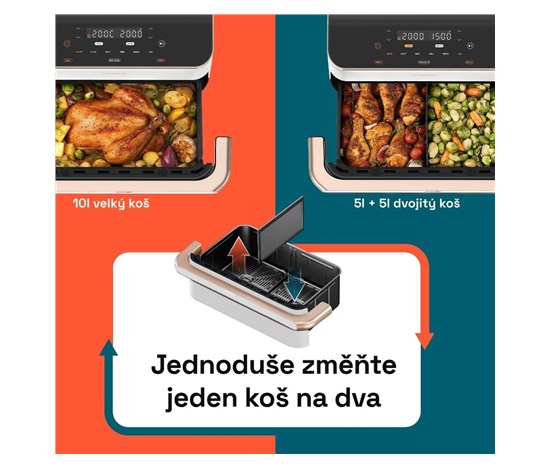 TwinFry nabídne obrovskou kapacitu 10 l. To znamená, že v ní připravíte celé kuře včetně přílohy, upečete kus masa nebo prostě XXL porci čehokoliv. Pokud to bude třeba, dodávaným děličem uděláte z koše 2x 5 l. Tím odpadá největší slabina fritéz – nemožnost vařit jídlo i přílohu najednou.