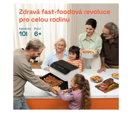 Chytrá horkovzdušná fritéza Cosori TwinFry přináší maximální objem varného prostoru pro početné rodiny nebo setkání a je doslova nadupaná funkcemi, které vám vaření maximální urychlí a usnadní. 10 litrový koš poslouží k přípravě velkých kusů masa, celé drůbeže, jehněčího hřbetu nebo mega porce hranolek. Opravdovým trumfem je možnost rozdělení koše přepážkou na dva 5 litrové a tak si můžete připravit hlavní jídlo a přílohu odděleně. S funkcí Sync navíc fritéza sladí přípravu obou tak, že vaření bude dokončeno ve stejný čas a vy budete mít své jídlo perfektní, čerstvé a chutné. Fritéza obsahuje 4 topná tělesa o celkovém výkonu 2800 W. Díky hornímu i spodnímu ohřevu odpadá nutnost protřepávání jídla během přípravy a také nutnost fritézu předehřát. Maximální teplota se zvýšila na 240 °C, takže fritéza zvládne i grilování. Jídlo můžete připravovat mnohem zdravěji, než s klasickými způsoby vaření jako je fritování v oleji. Například hranolky připravíte s jen jednou lžící oleje. Ve srovnání s pečením v troubě fritéza vyhřívá mnohem menší prostor, a tak spotřebuje pouze zlomek elektrické energie. Cosori TwinFry nabídne 6 univerzálních programů, které vám pokryjí všechny klasické způsoby přípravy jídla. Od pečení masa nebo zeleniny, sladké a slané pečení, grilování, fritování nebo přípravy zmražených jídel. Fritéza je navíc chytrá, a tak ji můžete ovládat vzdáleně přes aplikaci a mít přehled, kdy bude hotovo, zatímco vy potřebujete dokončit práci nebo se pobavit s dětmi. Fritéza prakticky zabírá jen plochu koše, a tak se hodí do všech kuchyní. Koš fritézy se snadno čistí a je možné jej mýt v myčce nádobí. V balení naleznete praktické kleště na bezpečnou manipulaci s jídlem.