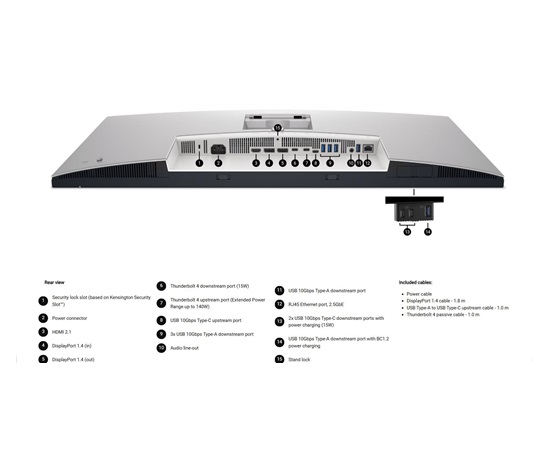 - 1 Thunderbolt 4 upstream port (DP1.4 (HDCP 2.2) with DSC support, PD: Up to 140W EPR , 2/4 Lanes switching)