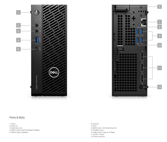 6. Lock slot 7. RJ-45 8. USB 3.2 Gen 1 with Smart Power-On 9. (2) USB 3.2 Gen 1 10. USB 3.2 Gen 2 Type A (10 Gbps) 11. (3) DP 1.4 Ports 12. Power connector