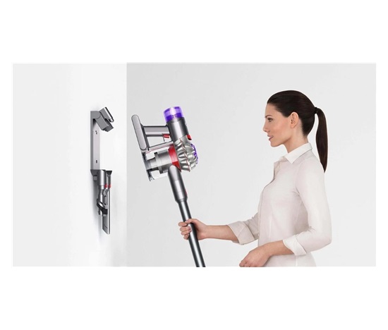 Vysavač Dyson V8 se zasouvá do úchytu na stěně, který slouží k nabíjení vysavače i úhlednému uložení příslušenství. Jedná se o praktické řešení, které je vždy po ruce.