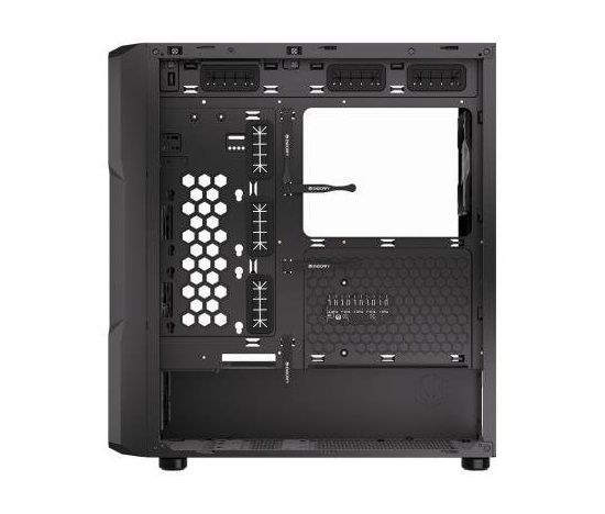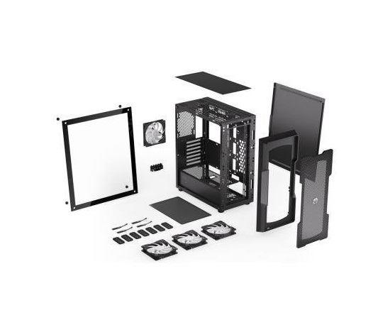 Skříň formátu Middle Tower s průhlednou bočnicí z tvrzeného skla nabízí dvě 2,5″ pozice pro SSD disky a dvě 3,5″ pozice pro pevné disky. Na horní části se nachází dva USB 3.0 porty, sluchátkový výstup a audio vstup pro mikrofon. Vybavena je čtyřmi 120 mm ventilátory s ARGB podsvícením, které spolu s perforovaným čelním panelem zajišťují dostatečné proudění vzduchu. Důmyslné řešení umožňuje pohodlné umístění až 360 mm dlouhého výměníku vodního chlazení na přední straně. Ve skříni je dostatek prostoru pro chladič CPU do výšky až 162 mm a grafickou kartu o délce až 370 mm. Dodávána je bez zdroje. Součástí je také interní ARGB ovladač a sada prachových filtrů.