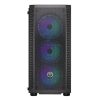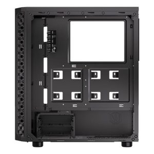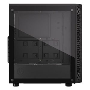 Skříň formátu Middle Tower s průhlednou bočnicí z tvrzeného skla nabízí dvě 2,5″ pozice pro SSD disky a dvě 3,5″ pozice pro pevné disky. Na horní části se nachází dva USB 3.0 porty, sluchátkový výstup a audio vstup pro mikrofon. Vybavena je čtyřmi 120 mm ventilátory s ARGB podsvícením, které spolu s perforovaným čelním panelem zajišťují dostatečné proudění vzduchu. Důmyslné řešení umožňuje pohodlné umístění až 360 mm dlouhého výměníku vodního chlazení na přední straně. Ve skříni je dostatek prostoru pro chladič CPU do výšky až 161 mm a grafickou kartu o délce až 350 mm. Dodávána je bez zdroje. Součástí je také sada prachových filtrů.