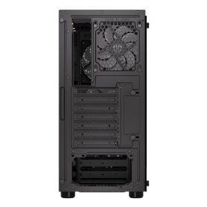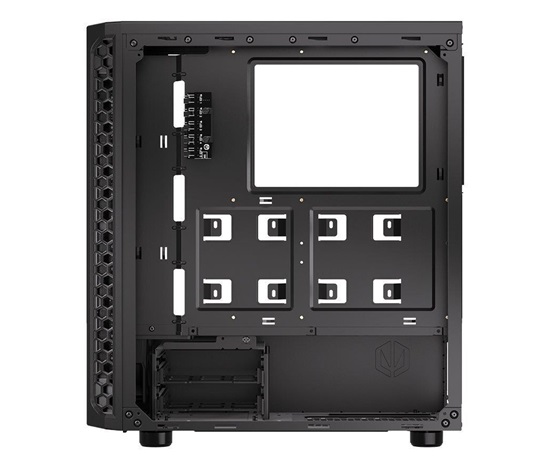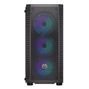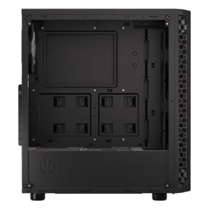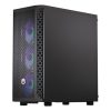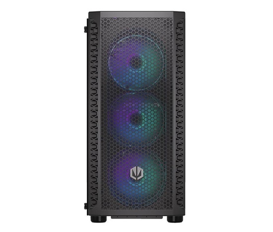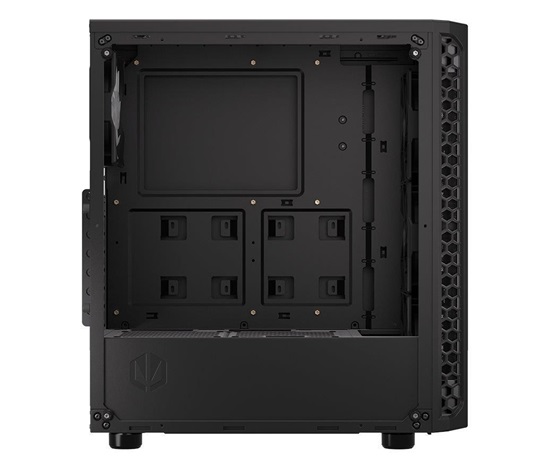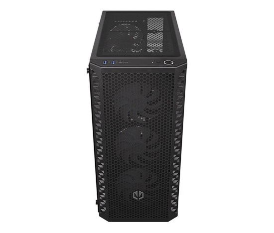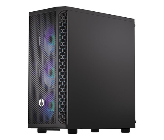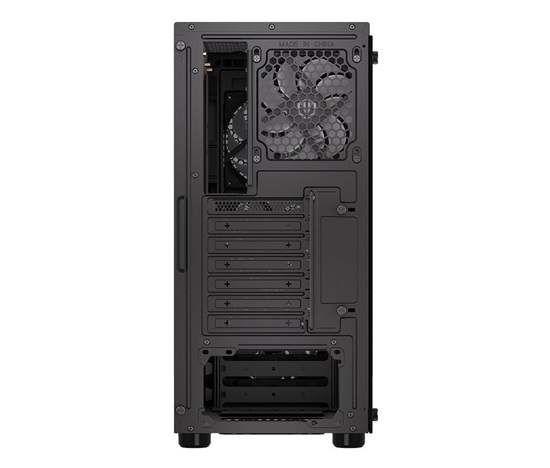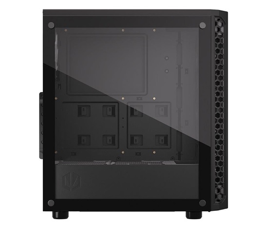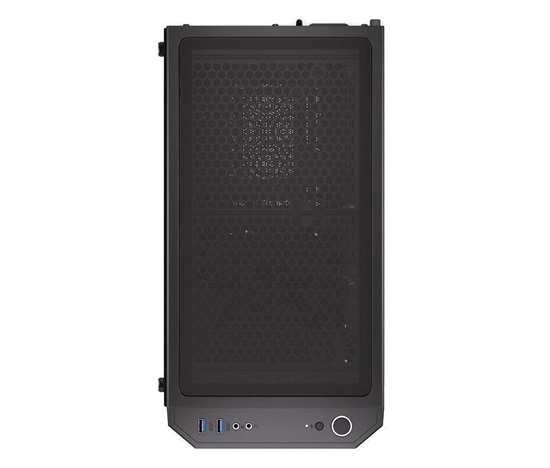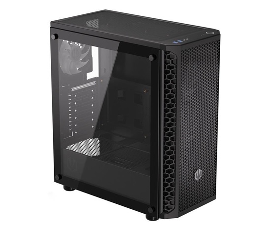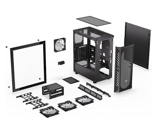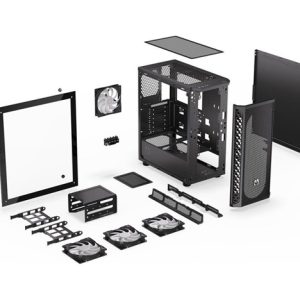 Skříň formátu Middle Tower s průhlednou bočnicí z tvrzeného skla nabízí dvě 2,5″ pozice pro SSD disky a dvě 3,5″ pozice pro pevné disky. Na horní části se nachází dva USB 3.0 porty, sluchátkový výstup a audio vstup pro mikrofon. Vybavena je čtyřmi 120 mm ventilátory s ARGB podsvícením, které spolu s perforovaným čelním panelem zajišťují dostatečné proudění vzduchu. Důmyslné řešení umožňuje pohodlné umístění až 360 mm dlouhého výměníku vodního chlazení na přední straně. Ve skříni je dostatek prostoru pro chladič CPU do výšky až 161 mm a grafickou kartu o délce až 350 mm. Dodávána je bez zdroje. Součástí je také sada prachových filtrů.