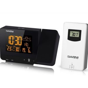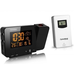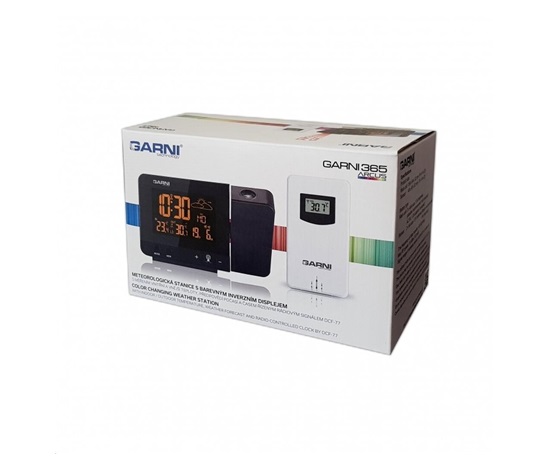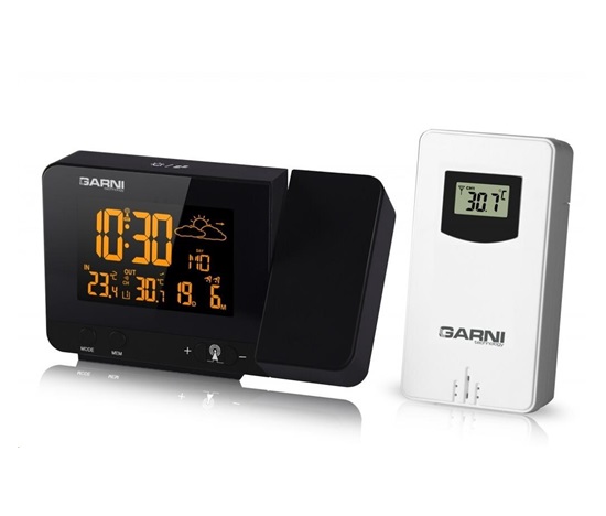 Meteorologická stanice se špičkovým inverzním barevným VA displejem s časem řízeným rádiovým signálem DCF-77, budíkem, měřením vnitřní teploty, bezdrátovým čidlem pro měření vnější teploty a projekcí času a vnitřní / venkovní teploty