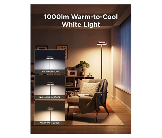 Spodní LED zóna poskytuje jasné a kvalitní bílé světlo až 1000 lumenů, vhodné pro čtení, práci nebo každodenní aktivity. Díky kombinaci teplého a studeného světla můžete přesně nastavit tón osvětlení podle nálady. Tento výkon zajišťuje, že lampa je zároveň praktická i stylová.