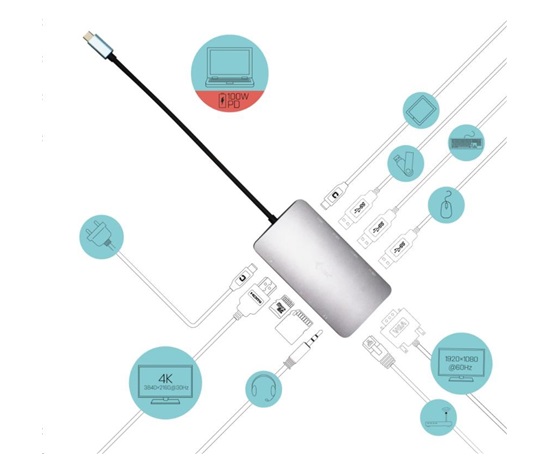 Malá kovová USB-C dokovací stanice, která dokáže snadno připojit externí monitor či projektor, a to prostřednictvím portu HDMI nebo VGA. Jednoduše připojte váš notebook či tablet (instalace ovladačů není nutná) a využijte rychlého datového USB, připojení k internetu prostřednictvím LAN portu, spolu s možností připojit vaše sluchátka a mikrofon. Samozřejmostí je podpora napájení vašeho notebooku, a to až do 100 W, což znamená, že budete schopni nabít všechny notebooky a tablety, které nabíjení prostřednictvím USB-C (USB-C Power Delivery) podporují.