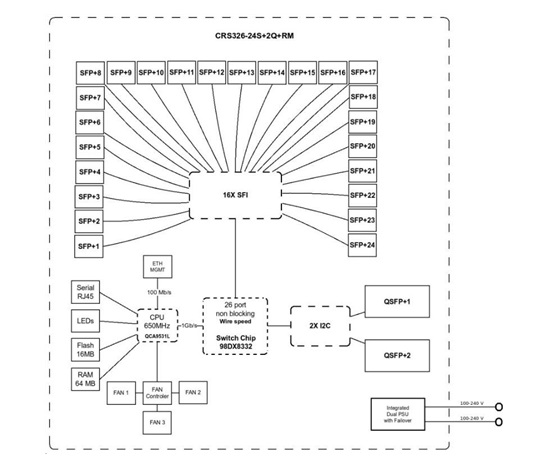 Switch má celkově 2x QSFP+ porty a 24x SFP+ portů, což poskytuje celkovou propustnost 320 Gbps a přepínací kapacitu 640 Gbps s rychlostí přeposílání 252 Mpps u většiny běžných paketů.