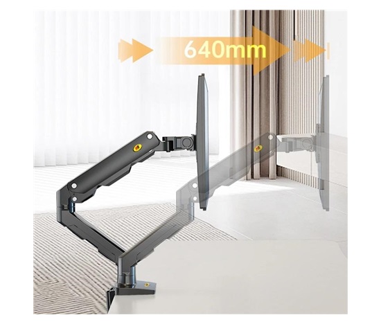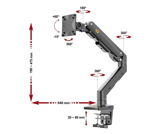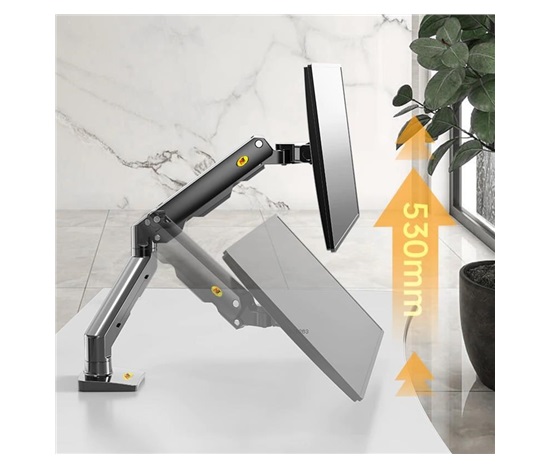 Jeden z nejkvalitnějších stolních držáků pro zavěšení širokoúhlých monitorů nebo All in One PC – profesionální, poctivá konstrukce, dizajn propracovaný do detailu a velmi snadné polohování. Držák doporučujeme i náročným zákazníkům, do vytížených provozů, kanceláří nebo showroomů. Své uplatnění najde na každém stole. Držák je ideální na širokoúhlé i klasické monitory, All in One Pc nebo televizory s úhlopříčkou 27-45″, u širokoúhlých monitorů může být úhlopříčka i větší. Podmínkou je hmotnost v rozmezí 5-16kg, u lehčích obrazovek nebude možné výškové polohování. Držák podporuje VESA 75×75 a 100×100, v případě potřeby nabízíme i rozšíření na 200×100, 100×200 a 200×200. Kompletní polohovatelnost: otáčení +/-180°, naklápění +60°/-15°, snadné nastavení výšky díky plynovému pístu od 195mm až do 475mm, nastavení vzdálenosti od úchytu 0-640mm, funkce pivot, port USB, propracované vedení kabeláže, 2 typy stolních úchytů.