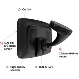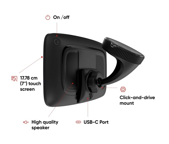 Na 7″ dotykové obrazovce si můžete prohlédnout svou trasu ve vysokých detailech. A díky ovládání pomocí hlasových příkazů můžete zařízení GO Camper Max ovládat, aniž byste museli sundat ruce z volantu. Snadno použitelný držák Click-and-Drive navíc drží navigační zařízení bezpečně na místě.