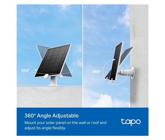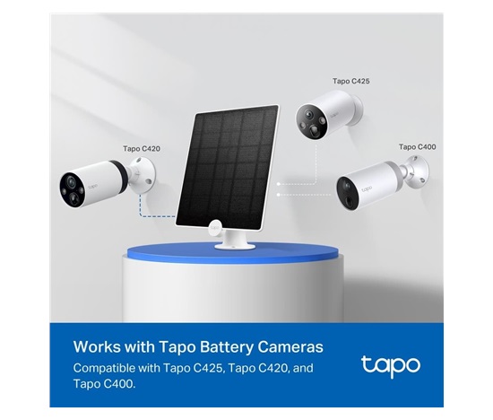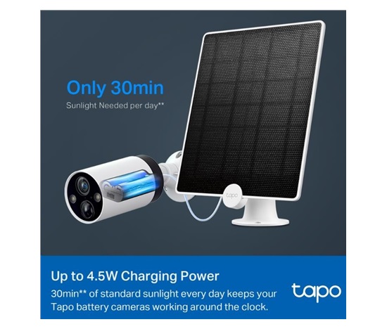 - Non-Stop Solar Power-Zachycuje bezplatnou, čistou sluneční energii a poskytuje nepřetržité napájení pro vaše kamery Tapo napájené bateriemi (Tapo C425, Tapo C420), aby vás chránily po celý rok.
