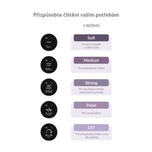 Sprcha nabízí 5 režimů čištění s různými intenzitami tlaku (8-110 PSI), od těch nejnižších až po hloubkové čištění.