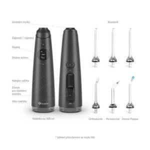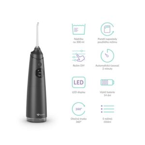 U AquaFloss Compact C300 máte na výběr z pěti čistících režimů, díky kterým si čištění zubů plně přizpůsobíte. Do nádržky o kapacitě 300 ml můžete kromě vody nalít i ústní vodu pro extra porci svěžesti a hygieny. Tryska sprchy je otočná o 360 stupňů a dostane se i do těch nejmenších mezizubních prostor, odkud odstraní až 99 % zubního plaku. Spolu se sonickým kartáčkem snižuje riziko vzniku zubního kazu i zánětu dásní a ušetří vás nepříjemných návštěv stomatologa i nečekaných výdajů.