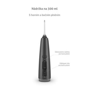 Nádržka o objemu 300 ml vystačí na vyčištění celého chrupu a zároveň je dostatečně kompaktní. Kromě obyčejné vody jí můžete naplnit ústní vodou pro extra svěžest.
