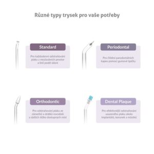 Součástí balení je 6 různých druhů trysek C-series, sprchu tak může využívat celá rodina. Další trysky pro různé dentální potřeby lze případně dokoupit.