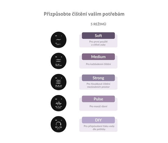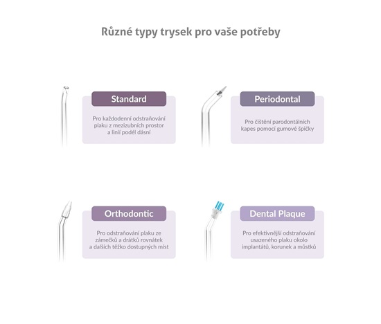 Součástí balení je 6 různých druhů trysek C-series, sprchu tak může využívat celá rodina. Další trysky pro různé dentální potřeby lze případně dokoupit.