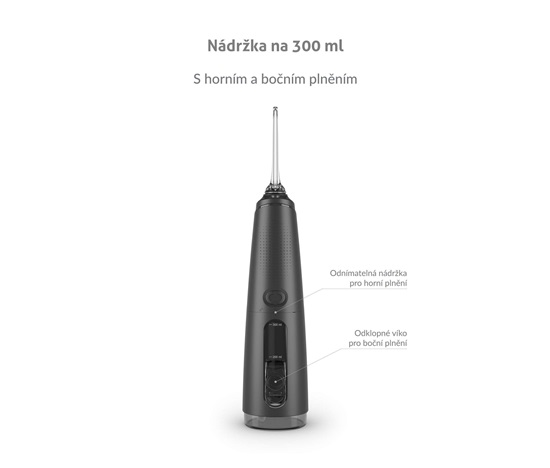 Nádržka o objemu 300 ml vystačí na vyčištění celého chrupu a zároveň je dostatečně kompaktní. Kromě obyčejné vody jí můžete naplnit ústní vodou pro extra svěžest.