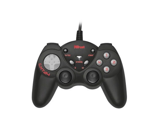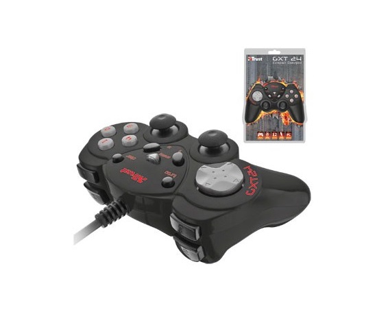 Gamepad Trust GXT 24 má pogumovaný povrch pro lepší uchopení. Je vybaven velkým počtem tlačítek pro pohodlné hraní i velmi pokročilých her na PC. Tento robustní gamepad obsahuje 8směrný D-pad, 2 analogové joysticky a 12 programovatelných akčních tlačítek.