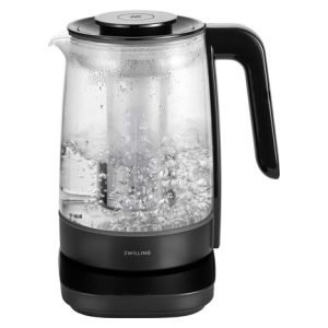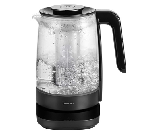 Konvice na přípravu čaje ve stylovém designu: konvice ZWILLING Enfinigy v černé barvě. Příprava čaje se spouští volbou teploty na základní stanici 360°. Díky funkci předvaření dokáže skleněná konvice nejprve ohřát vodu na 100 °C a poté signalizuje dosažení zvolené teploty. Nyní stačí čaj nasypat přímo do nerezové čajové vložky.