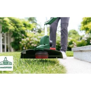 Ergonomický design rukojeti ve tvaru písmene V pro pohodlný postoj při práci, funkce IntelliFEED automaticky odvíjí strunu pro práci bez přerušování, všestranná hlava umožňuje náklon a úpravu okrajů bez použití rukou, sečení trávy a plevelů, zastřihování trávníků a úprava okrajů