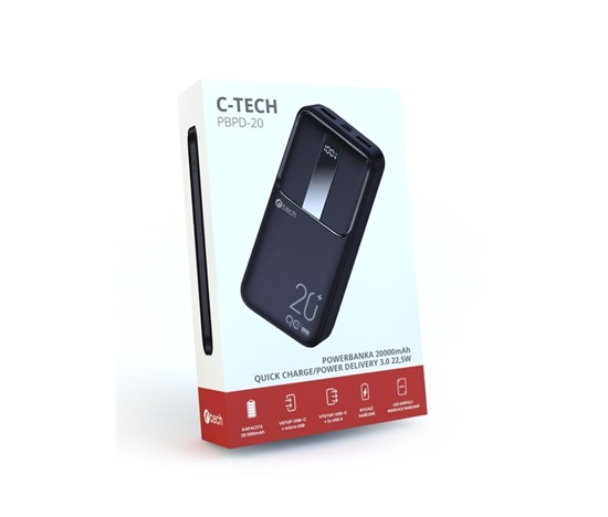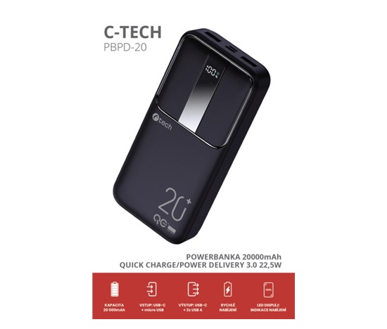 C-TECH Powerbanka 20000mAh, Li-Pol, 22,5W, USB-C/USB-A/micro USB
