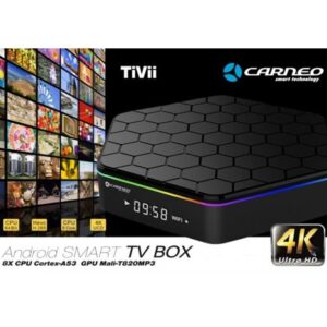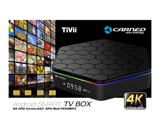 CARNEO TiVii Android Smart TV Box promění váš domácí televizor na moderní Smart TV s přístupem k internetu prostřednictvím vestavěného WiFi adaptéru. Stahujte tisíce her a aplikací pro OS Android ™.