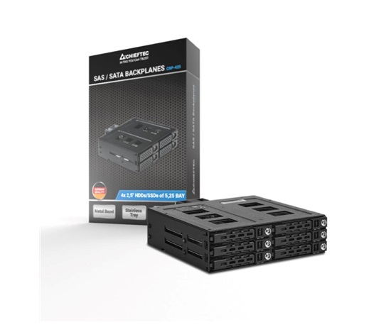 Nová zadní deska CBP-625 SAS nastavuje standard díky patentované antivibrační konstrukci. Jako žádná jiná základní deska je vhodná pro různé aplikace. Šasi je vyrobeno z vysoce kvalitního hliníku a nastavuje nový standard tím, že poskytuje možnost montáže 6x 2,5„ HDD/SSD//SATA I /II/III a SAS I /II/III pomocí 1x 5,25“ slotu.