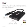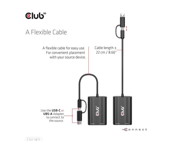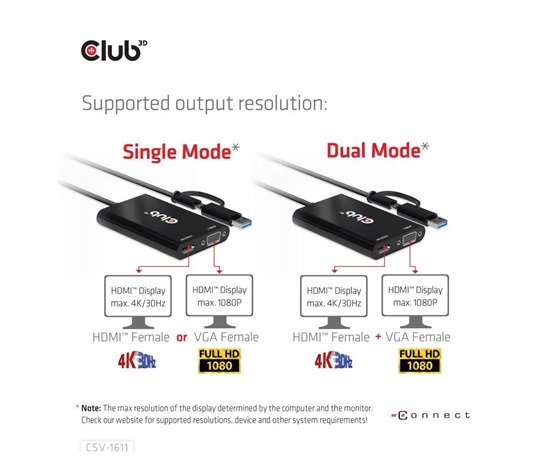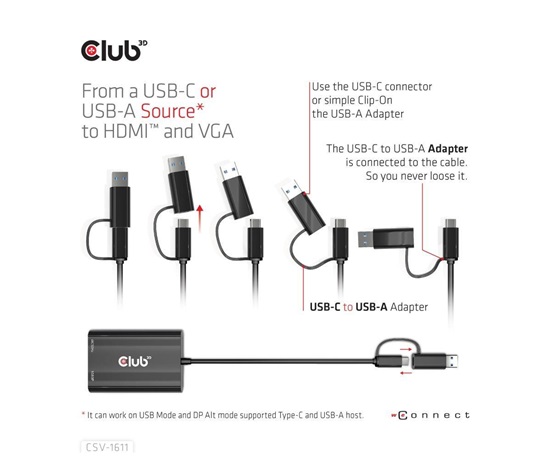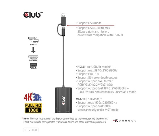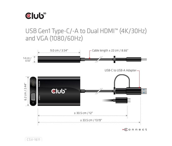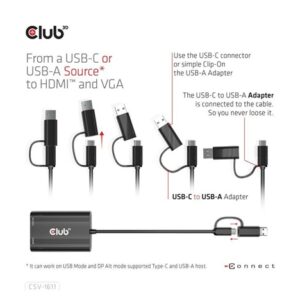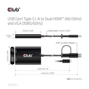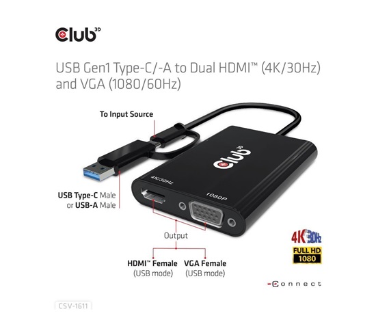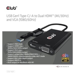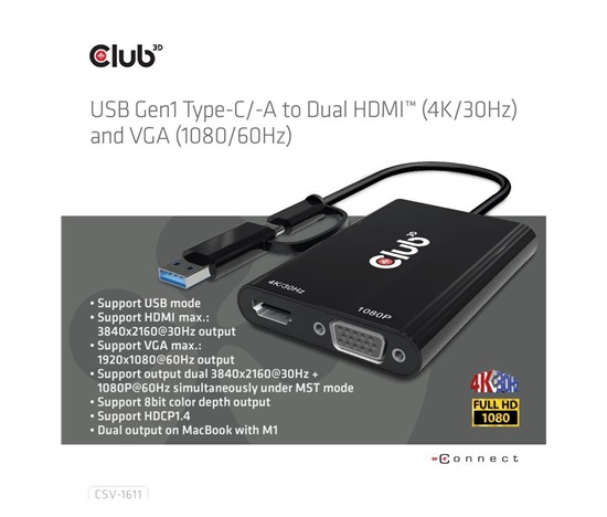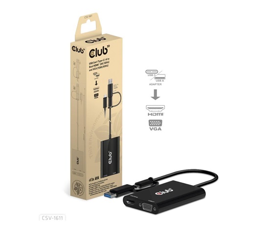 Adaptér Club 3D CSV-1611 USB Gen1 Type-C/-A na duálny HDMI™ (4K/30Hz) a VGA (1080/60Hz) je duálny adaptér, ktorý poskytuje najmodernejšie a najúčinnejšie riešenie na rozšírenie jedného portu USB Type-C alebo Type-A na displeje HDMI™ a VGA. Podporuje jeden HDMI™ 4K/30Hz a VGA 1080P/60Hz alebo duálny 4K/30Hz + VGA 1080P/60Hz simultánny výstup rôznych videí. Môže pracovať v režime USB a v režime DP Alt s podporou hostiteľa typu C a USB-A. Duálny video výstup na MacBooku s M1. Podporuje USB Gen1 s maximálnou rýchlosťou prenosu dát 5 Gb/s. Zariadenie sa napája prostredníctvom hostiteľského pripojenia USB typu A alebo typu C. Nie je potrebné žiadne externé napájanie.