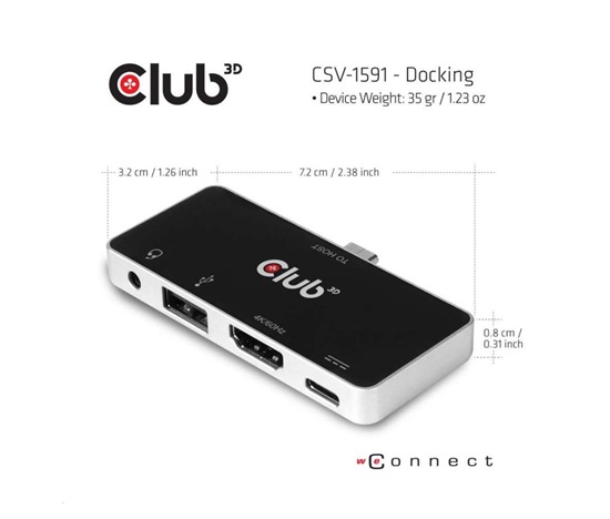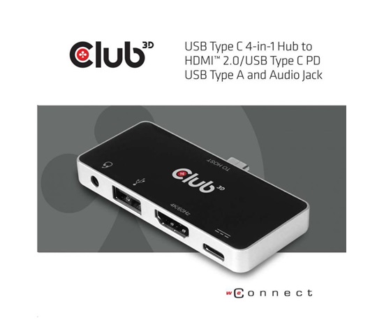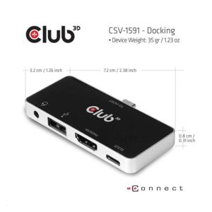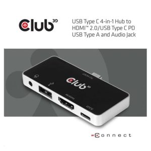 CSV-1591 – Club 3D Hub je rozbočovač 4 v 1 USB typu C s rozhraním HDMI™, USB typu A 2.0, 3.5 mm audio a nabíjanie cez USB typu C PD, dizajn dokonale vyhovuje všetkým zariadeniam s režimom DP Alt. S týmto rozbočovačom si môžete vychutnať video s ultra vysokým rozlíšením hostiteľa na veľkej obrazovke, vychutnať si fantastickú hudbu, prenášať USB 2.0 a pripojte adaptér USB typu C PD na nabíjanie hostiteľa.