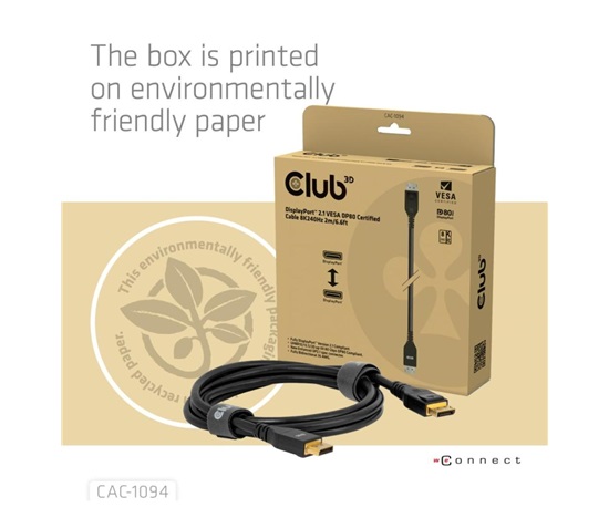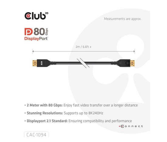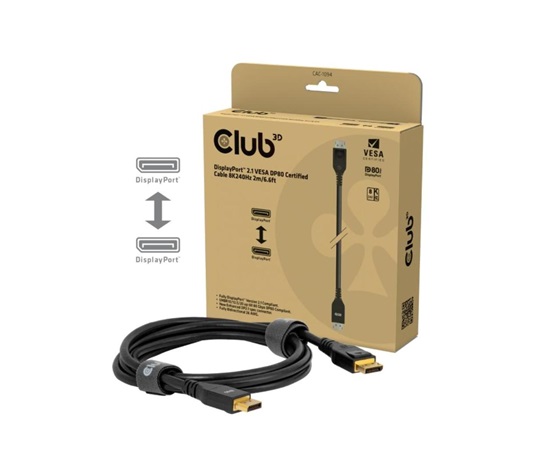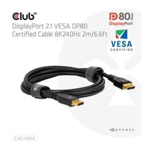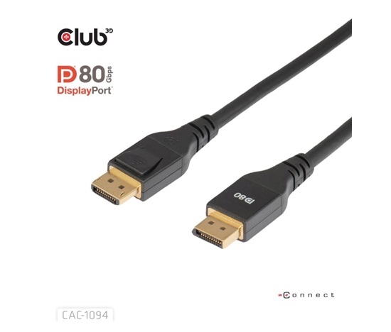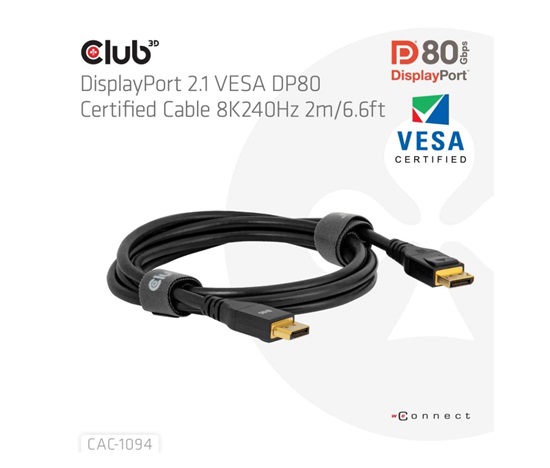 Kabel Club 3D CAC-1094 DisplayPort 2.1 umožňuje připojení počítače nebo notebooku s podporou DisplayPort (herní) k monitoru s (ultra)vysokým rozlišením nebo jinému zařízení s podporou DisplayPort. DisplayPort 2.1 UHBR10/13,5/20 až do rychlosti 80 Gb/s, má také podporu pro Display Stream Compression 1.2 (DSC), Forward Error Correction a rozšiřuje maximální počet inline audio kanálů na 32. Je vybaven uzamykatelnými konektory DisplayPort, které zajišťují bezpečné a spolehlivé připojení, s NOVÝMI kontaktními prsty speciálně navrženými pro tyto vysoké rychlosti v kabelu 26 AWG.