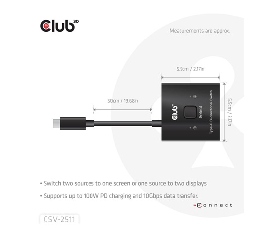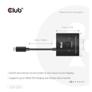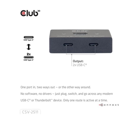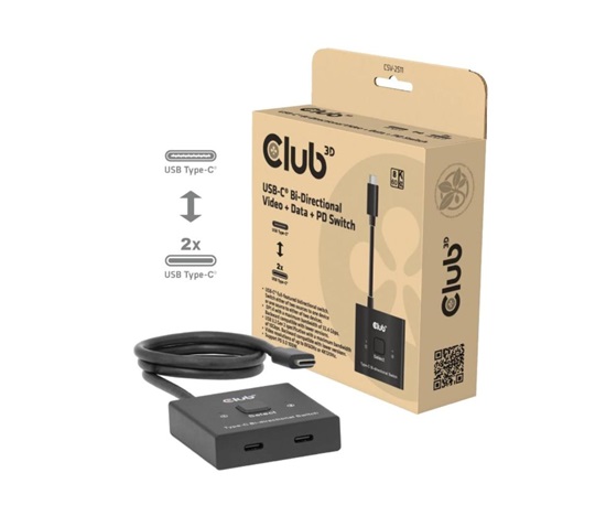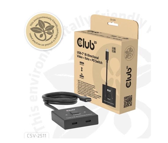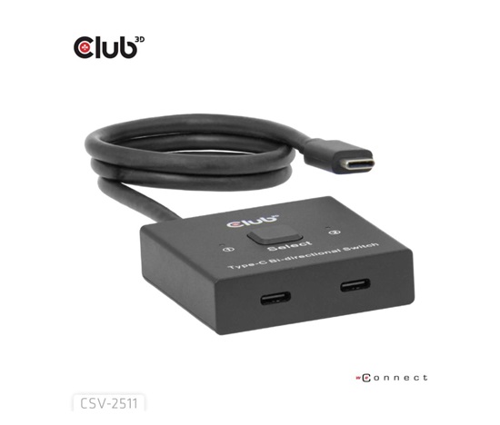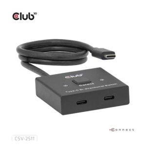 Plnohodnotný obousměrný přepínač Club 3D CSV-2511 může přepínat dva zdroje na jeden displej nebo jeden zdroj na jeden ze dvou displejů. Tento přepínač podporuje více rozlišení a až 8K nebo přenos dat max. 10 Gb/s nebo nabíjení PD3.0 max. 100 W PD. Může pracovat na všech hostitelských zařízeních USB-C, kompatibilních se zařízeními Thunderbolt.