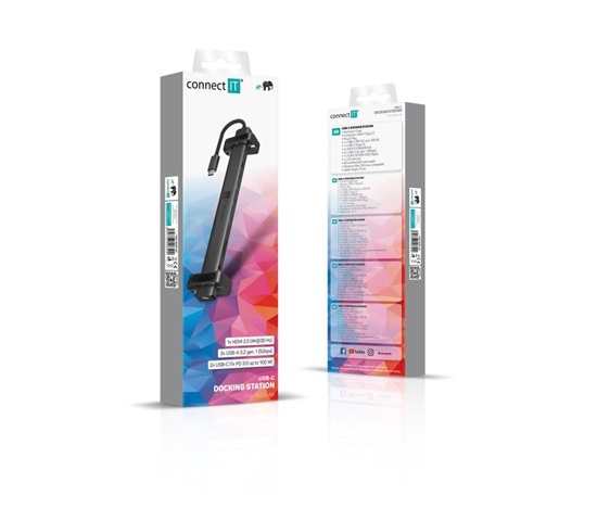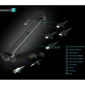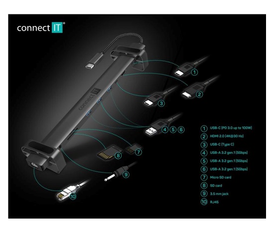 CONNECT IT Dokovací stanice USB-C 10v1, 1xHDMI, 2xUSB-C, 3xUSB, 1xRJ45, černá