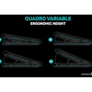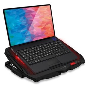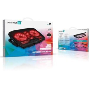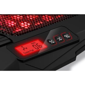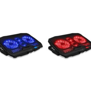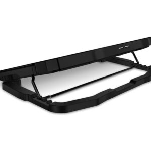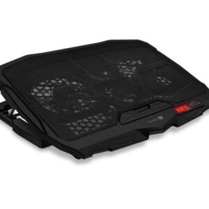 Chladicí podložka pod notebook se čtyřmi šestirychlostními ventilátory, digitálním displejem, výškovým polohováním ve 4 úrovních a dvěma USB porty. Podložka zajišťuje jak odvod tepla z notebooku a jeho ventilačních otvorů, tak i přímé ochlazování pláště notebooku díky cirkulaci chladného vzduchu a celkově tak zvyšuje výkon notebooku. Je plně kompatibilní s notebooky až do velikosti 15,6″ a díky kompaktním rozměrům je předurčena jak pro práci doma a v kanceláři, tak i pro cestování a časté přenášení. Ultratichý chod 4 ventilátorů vás nebude rušit ani při nejnáročnější práci vyžadující maximální soustředění. Výšková polohovatelnost ve 4 různých stupních vám zajišťuje maximální pohodlí i při delších pracovních či herních sezeních.