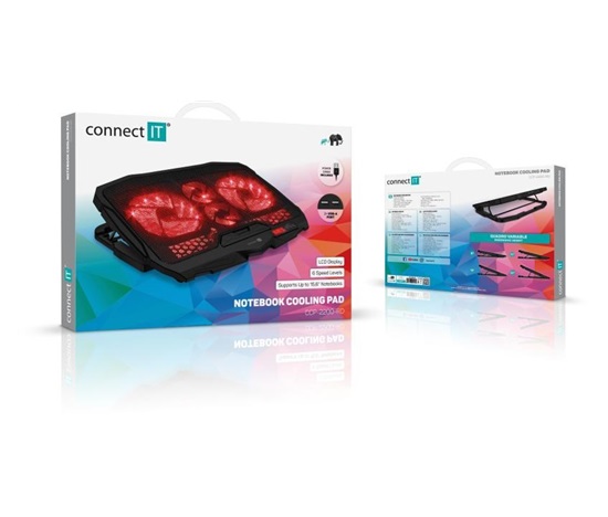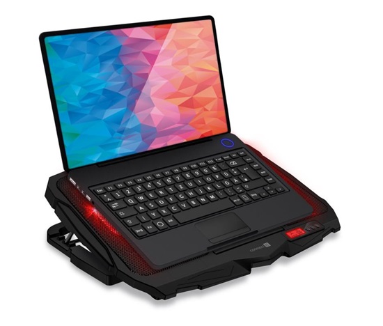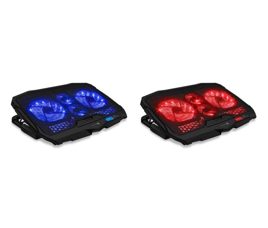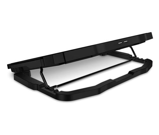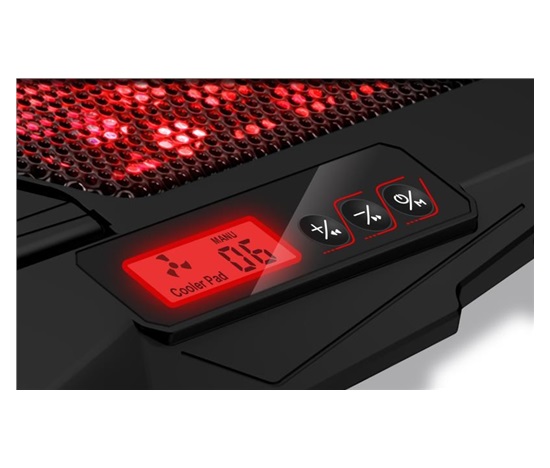 Chladicí podložka pod notebook se čtyřmi šestirychlostními ventilátory, digitálním displejem, výškovým polohováním ve 4 úrovních a dvěma USB porty. Podložka zajišťuje jak odvod tepla z notebooku a jeho ventilačních otvorů, tak i přímé ochlazování pláště notebooku díky cirkulaci chladného vzduchu a celkově tak zvyšuje výkon notebooku. Je plně kompatibilní s notebooky až do velikosti 15,6″ a díky kompaktním rozměrům je předurčena jak pro práci doma a v kanceláři, tak i pro cestování a časté přenášení. Ultratichý chod 4 ventilátorů vás nebude rušit ani při nejnáročnější práci vyžadující maximální soustředění. Výšková polohovatelnost ve 4 různých stupních vám zajišťuje maximální pohodlí i při delších pracovních či herních sezeních.