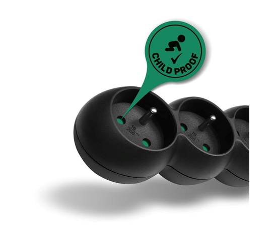 Prodlužovací kabelový přívod na 230V je vybaven hlavním síťovým vypínačem, který při vypnutí zcela odpojí od přívodu elektrické energie všechny zapojené spotřebiče najednou. Extra výbavou je dětská ochrana všech zásuvek – zásuvky jsou přístupné pouze v případě zasunutí obou vidlic najednou, nelze tedy zasunout jednotlivě např. pouze šroubovák nebo pletací jehlici. Díky pootočení zásuvek o 45° je možné používat i objemnější napájecí adaptéry nebo úhlové koncovky. Výsuvné očko v horní části zásuvkového modulu umožňuje zavěšení nebo pevnou instalaci na stěnu (s výhodou využijete např. v dílnách a garážích). Výrobek byl testován a certifikován v evropském testovacím centru a splňuje nejpřísnější bezpečnostní požadavky a nejnovější normy, takže umožňuje zapojení spotřebičů o celkovém příkonu až 2300 W.