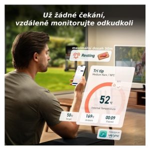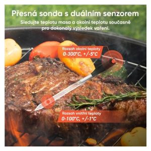 Naprostá kontrolu nad přípravou masa. Díky duálnímu senzoru nepřetržitě sleduje jak vnitřní teplotu masa, tak i teplotu okolního prostředí. To zajišťuje precizní výsledky a eliminuje veškeré dohady ohledně správné propečenosti. Aplikace vás včas upozorní, kdy maso otočit, a dokonce i kdy je ideální čas nechat ho odpočinout, aby bylo perfektně šťavnaté. Už žádné dohady, jen dokonalé výsledky pokaždé, když vaříte.