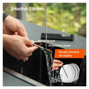 - Teploměr je voděodolný s hodnocením IP67, takže se snadno čistí