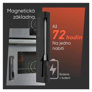 Teploměr COSORI získal prestižní ocenění iF Design Award 2023, což podtrhuje jeho dokonalý vzhled a robustní provedení. Sonda je vyrobena z nerezové oceli a keramiky, což zaručuje bezpečné a zdravé použití. Baterie sondy vydrží na jedno nabití až 72 hodin, což zaručuje nepřetržitý monitoring i během těch nejdelších příprav. Nabíjecí pouzdro má navíc integrovaný magnet, díky kterému ho můžete snadno připevnit na ledničku nebo jiný kovový povrch pro pohodlné uskladnění. Sonda je voděodolná s certifikací IP67, takže ji snadno umyjete ručně nebo v myčce. Vnitřní teplotní senzor měří maso v rozsahu 0° až 100°C s přesností ±1°C, zatímco senzor okolní teploty zvládá rozsah až do 300°C.