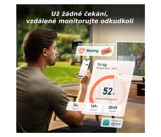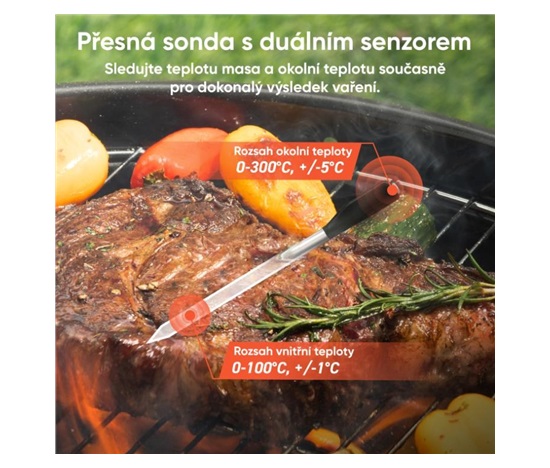 Naprostá kontrolu nad přípravou masa. Díky duálnímu senzoru nepřetržitě sleduje jak vnitřní teplotu masa, tak i teplotu okolního prostředí. To zajišťuje precizní výsledky a eliminuje veškeré dohady ohledně správné propečenosti. Aplikace vás včas upozorní, kdy maso otočit, a dokonce i kdy je ideální čas nechat ho odpočinout, aby bylo perfektně šťavnaté. Už žádné dohady, jen dokonalé výsledky pokaždé, když vaříte.