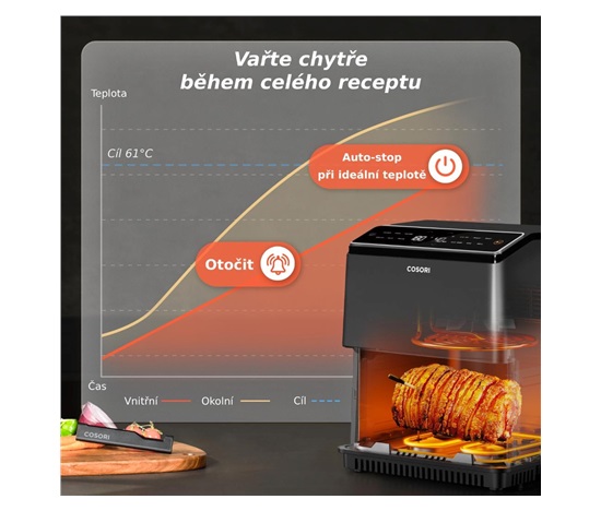 Aplikace COSORI funguje jako váš osobní průvodce vařením. Nejenže vás provede celým receptem, ale také vám v reálném čase posílá upozornění, kdy je ideální čas maso otočit nebo ho nechat odpočívat. Teploměr sleduje pokrok za vás, takže se můžete věnovat jiným věcem, aniž byste se museli obávat, že maso převaříte.