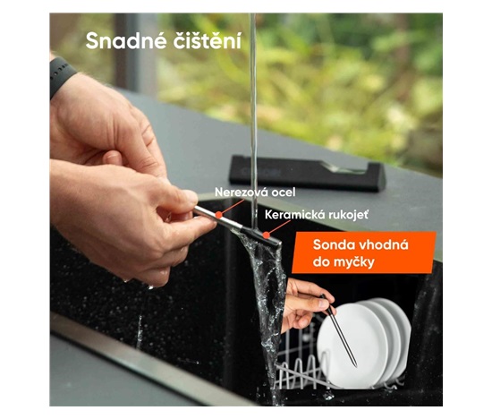 - Teploměr je voděodolný s hodnocením IP67, takže se snadno čistí