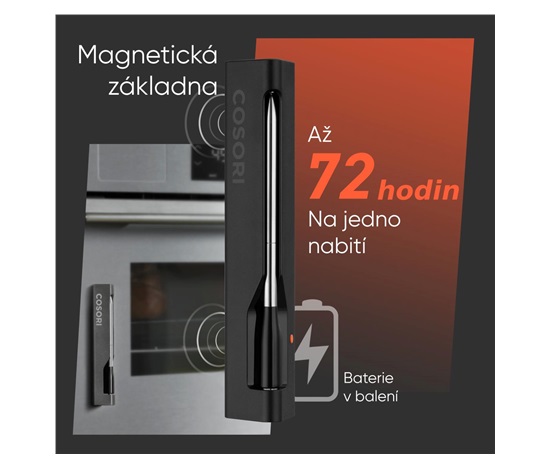 Teploměr COSORI získal prestižní ocenění iF Design Award 2023, což podtrhuje jeho dokonalý vzhled a robustní provedení. Sonda je vyrobena z nerezové oceli a keramiky, což zaručuje bezpečné a zdravé použití. Baterie sondy vydrží na jedno nabití až 72 hodin, což zaručuje nepřetržitý monitoring i během těch nejdelších příprav. Nabíjecí pouzdro má navíc integrovaný magnet, díky kterému ho můžete snadno připevnit na ledničku nebo jiný kovový povrch pro pohodlné uskladnění. Sonda je voděodolná s certifikací IP67, takže ji snadno umyjete ručně nebo v myčce. Vnitřní teplotní senzor měří maso v rozsahu 0° až 100°C s přesností ±1°C, zatímco senzor okolní teploty zvládá rozsah až do 300°C.
